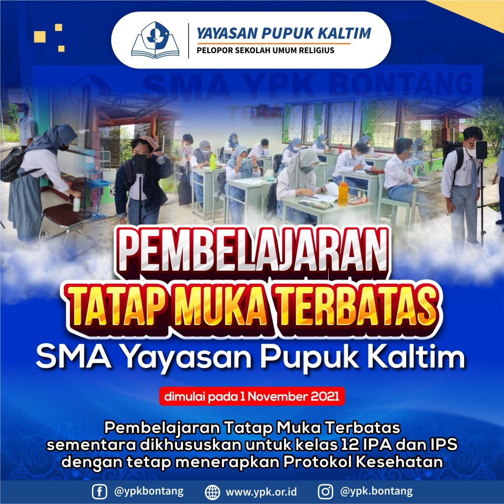 Pembelajaran Tatap Muka Terbatas (PTMT) adalah skema pembelajaran transisi dimana peserta didik akan mengikuti program pembelajaran secara tatap maya dan tatap muka sebelum sepenuhnya beralih menjadi skema pembelajaran tatap muka 100% dengan menerapkan protokol kesehatan covid-19. SMA Yayasan Pupuk Kaltim mulai 1 November 2021 telah melaksanakan PTMT. Mengingat kondisi Bontang per Oktober ini dari info grafis Gugus Covid Bontang, hampir semua wilayah sudah berwarna “hijau”. Tidak hanya itu, lebih dari 96% peserta didik SMA YPK telah mendapat vaksinasi dosis kedua. Izin dari Dinas Pendidikan Kota maupun Provinsi juga sudah diberikan.